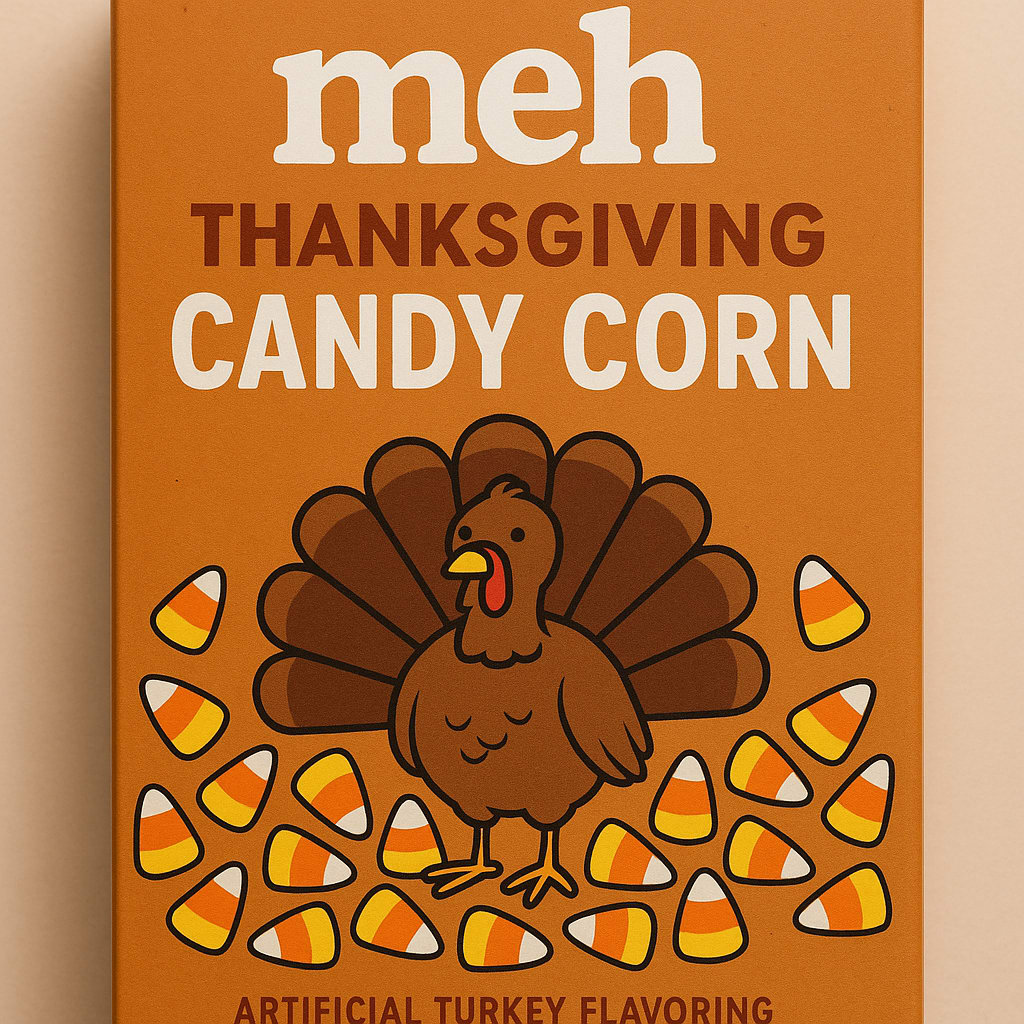 /showme a meh branded box of “Thanksgiving candy corn”, with “Artificial turkey flavoring” in small letters at the bottom. On the same box, show a turkey surrounded by candy corn.