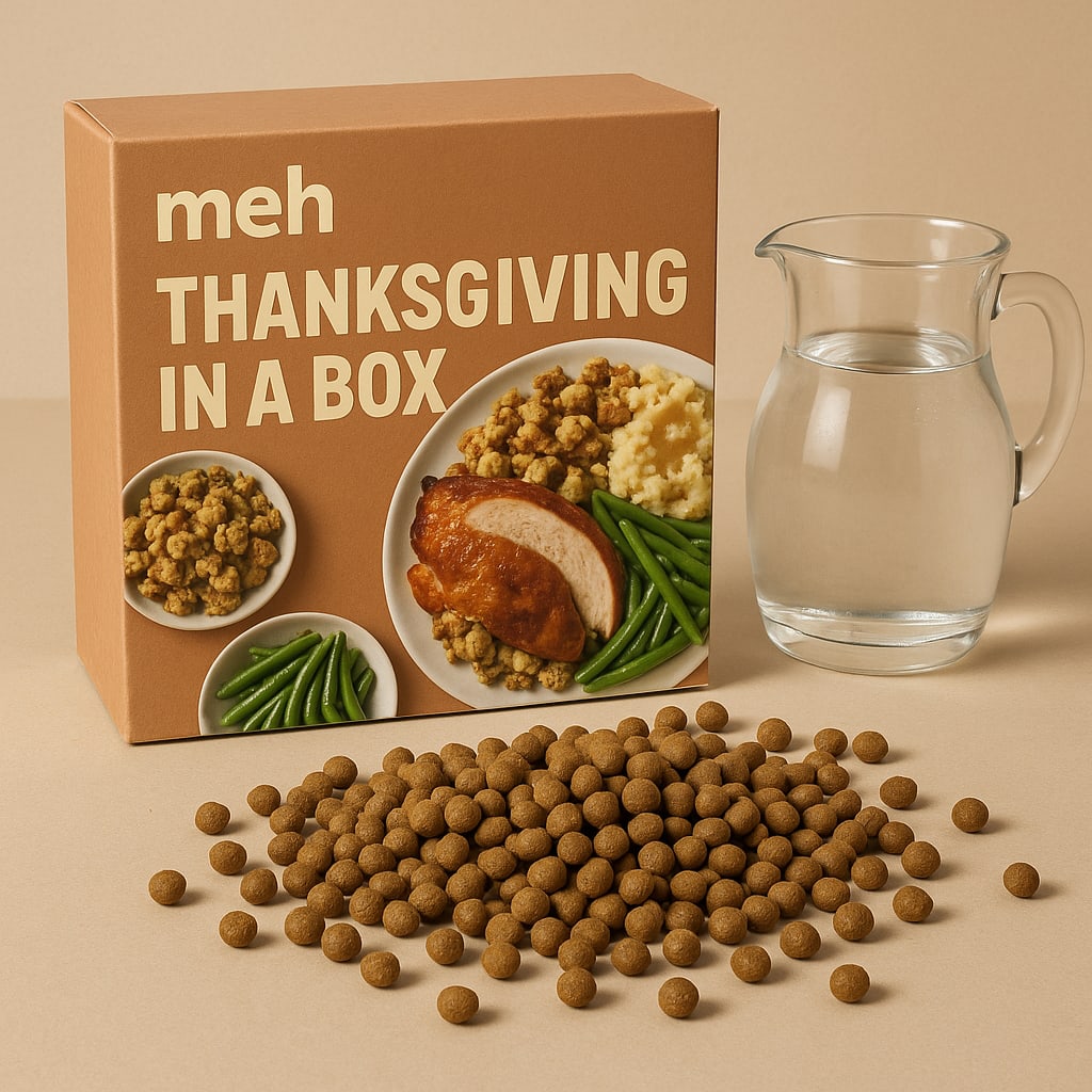 /showme a meh branded “Thanksgiving in a box” with a picture a turkey, stuffing, mashed potatoes, and green beans on the box. Spilled out on the table, show a bunch of food pellets and a pitcher of water.
