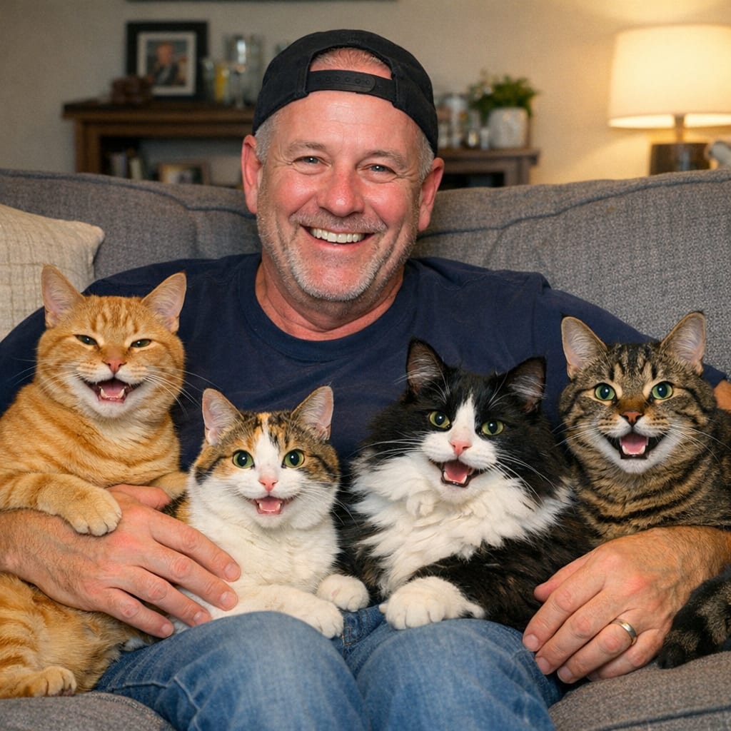@cfg83 Here’s the image you requested for “Human named sammydog01 with 4 happy cats on his couch.”