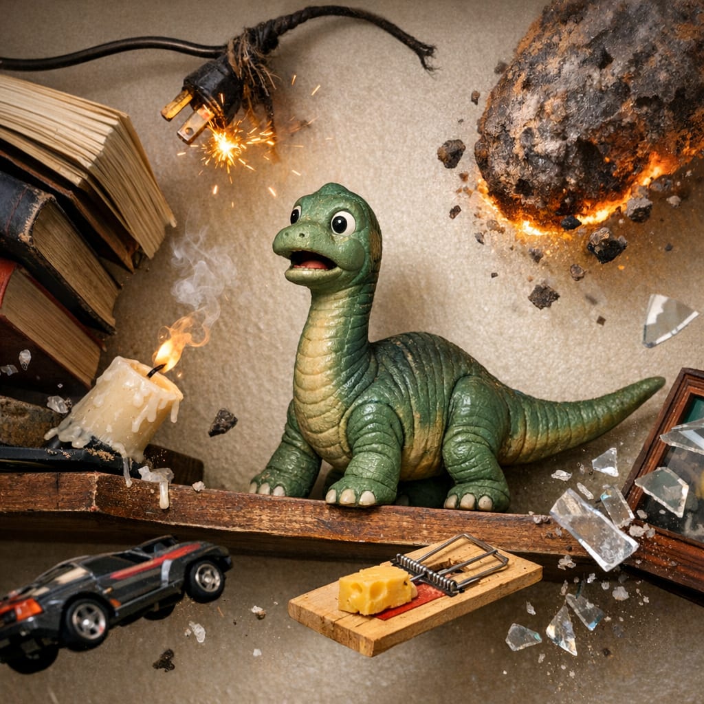 @therealjrn Here’s the image you requested for “how @cfg83 s baby brachiosaurus he got at Magic Mountain in the 1970s is in danger on a wall shelf”