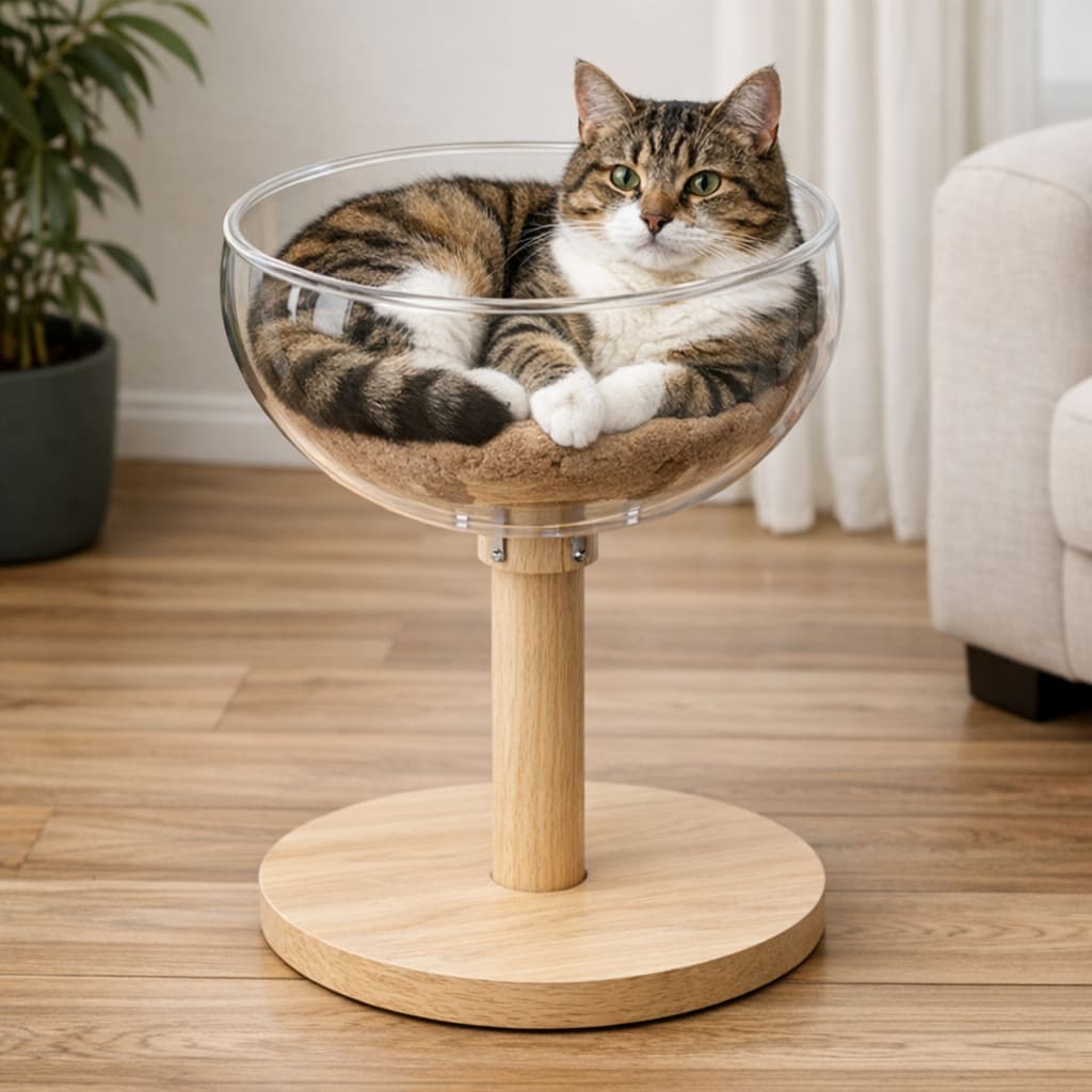 @cfg83 Here’s the image you requested for “cat lying inside clear glass bowl that is attached to pole that is attached to flat circular basel.”