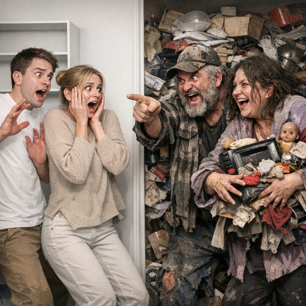 @cfg83 Here’s the image you requested for “Frightened minimalists being confronted by the Filthy Hoarders!”