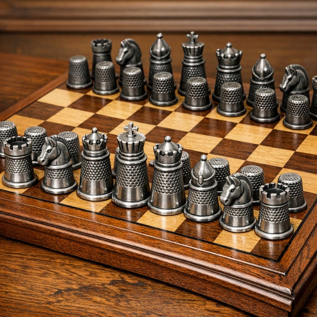 @cfg83 Here’s the image you requested for “Chess set that uses pewter thimbles as chess pieces.”