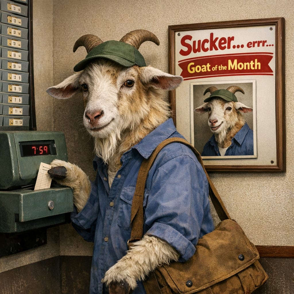 /showme Anthropomorphized goat clocking in to time clock with sign that says “Sucker … errr … Goat of the Month”.