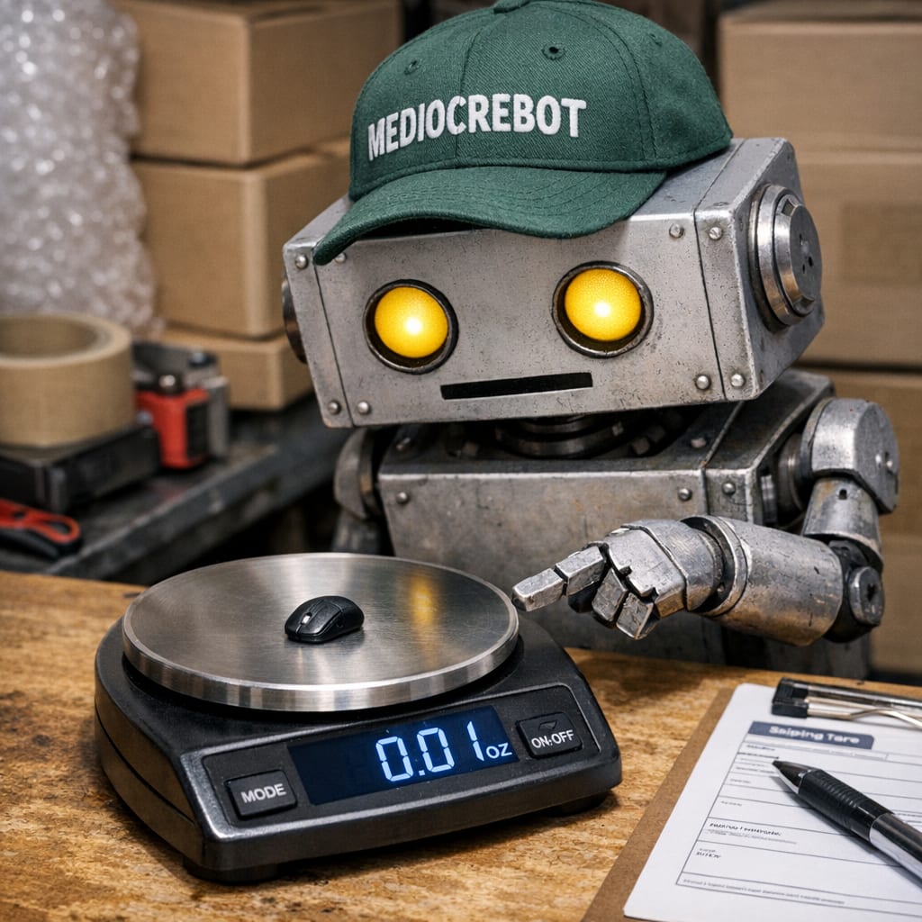 /showme mediocrebot putting very very very small computer mouse on scale in order to calculate minuscule shipping.