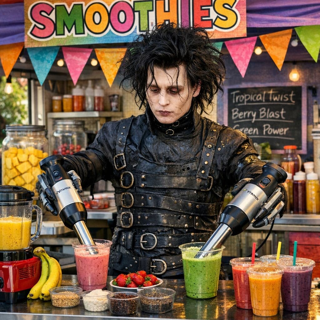 @zippyus Here’s the image you requested for “Edward Scissorhands with Vitamix stick blenders for hands working at a colorful smoothie stand”