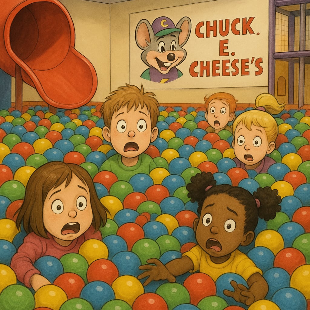 /showme a bunch of children lost in the ball pit at Chuck E Cheese restaurant