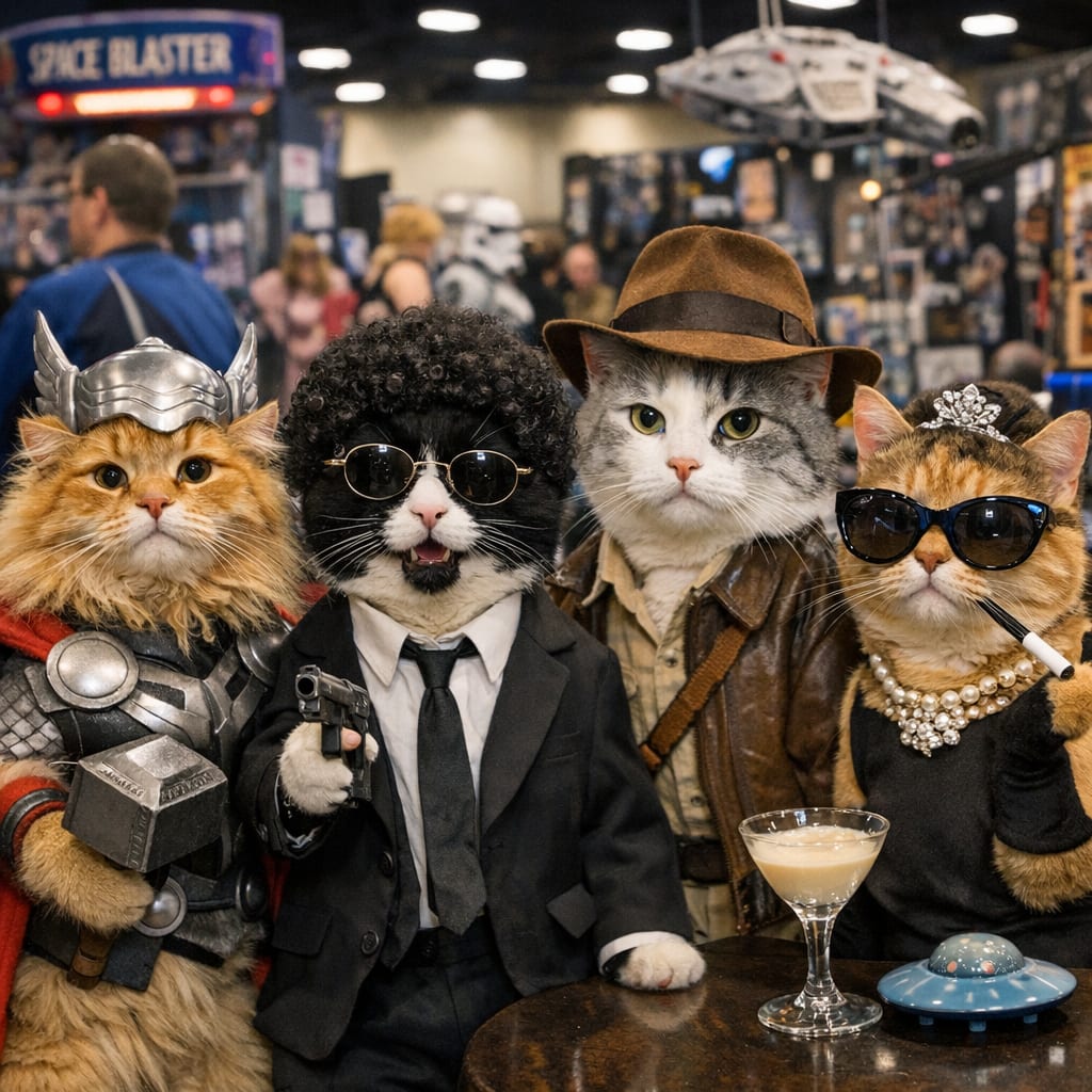 @mycya4me Here’s the image you requested for “real cats at a science fiction convention dressed up as their fav actors and having a lot of fun”