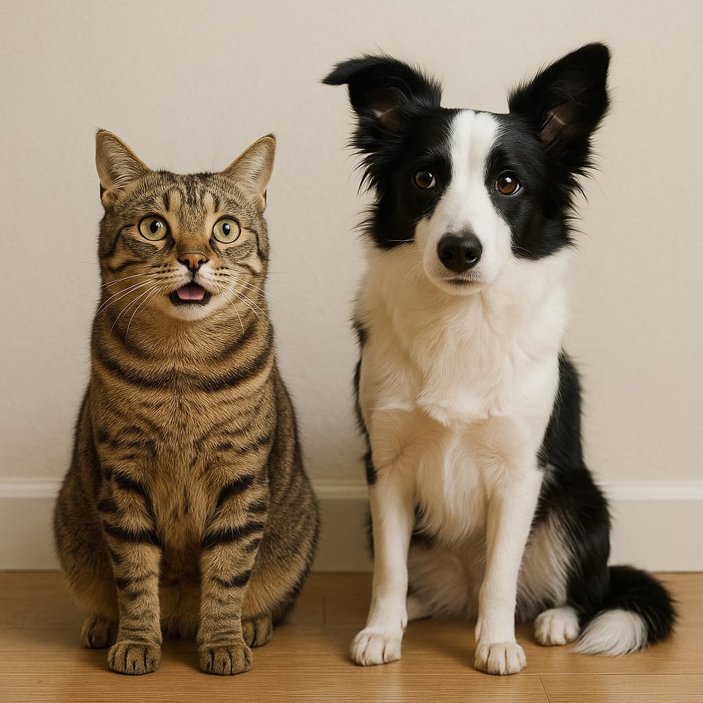 /showme a cat that thinks it’s a dog sitting next to a dog that thinks it’s a cat