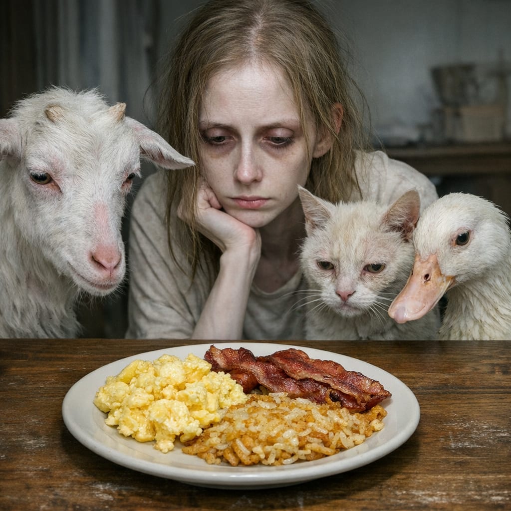/showme Anemic looking goat and anemic looking cat and anemic looking human and anemic looking duck staring at one plate of scrambled eggs, bacon, and hash browns.