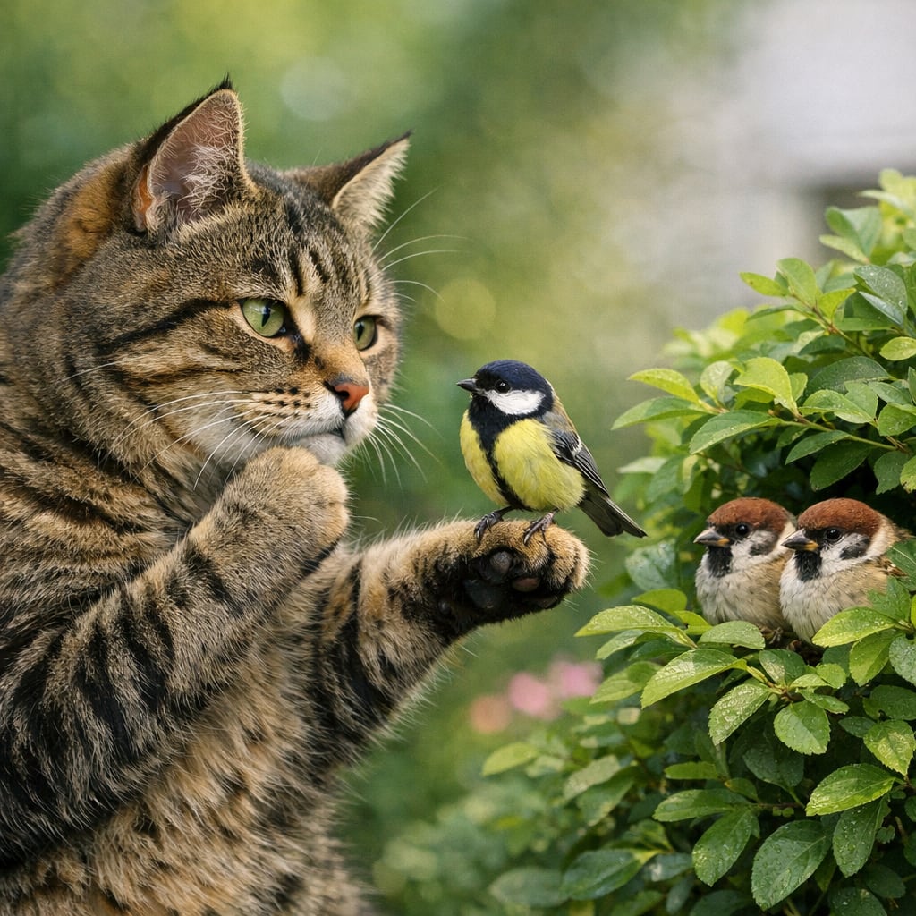/showme A cat pondering one bird standing on its paw and two birds sitting in a bush.