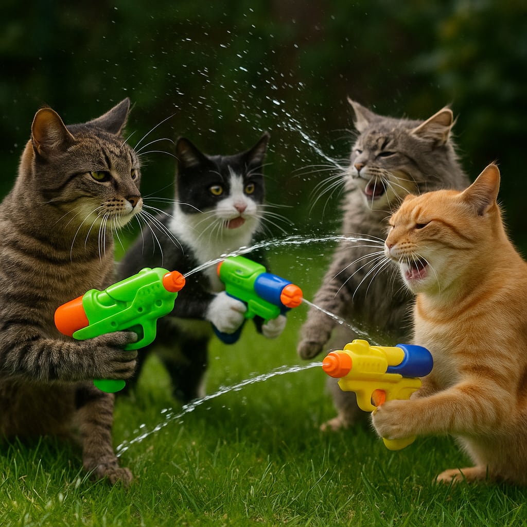 /showme real cats using water gun in a turf war against other cats