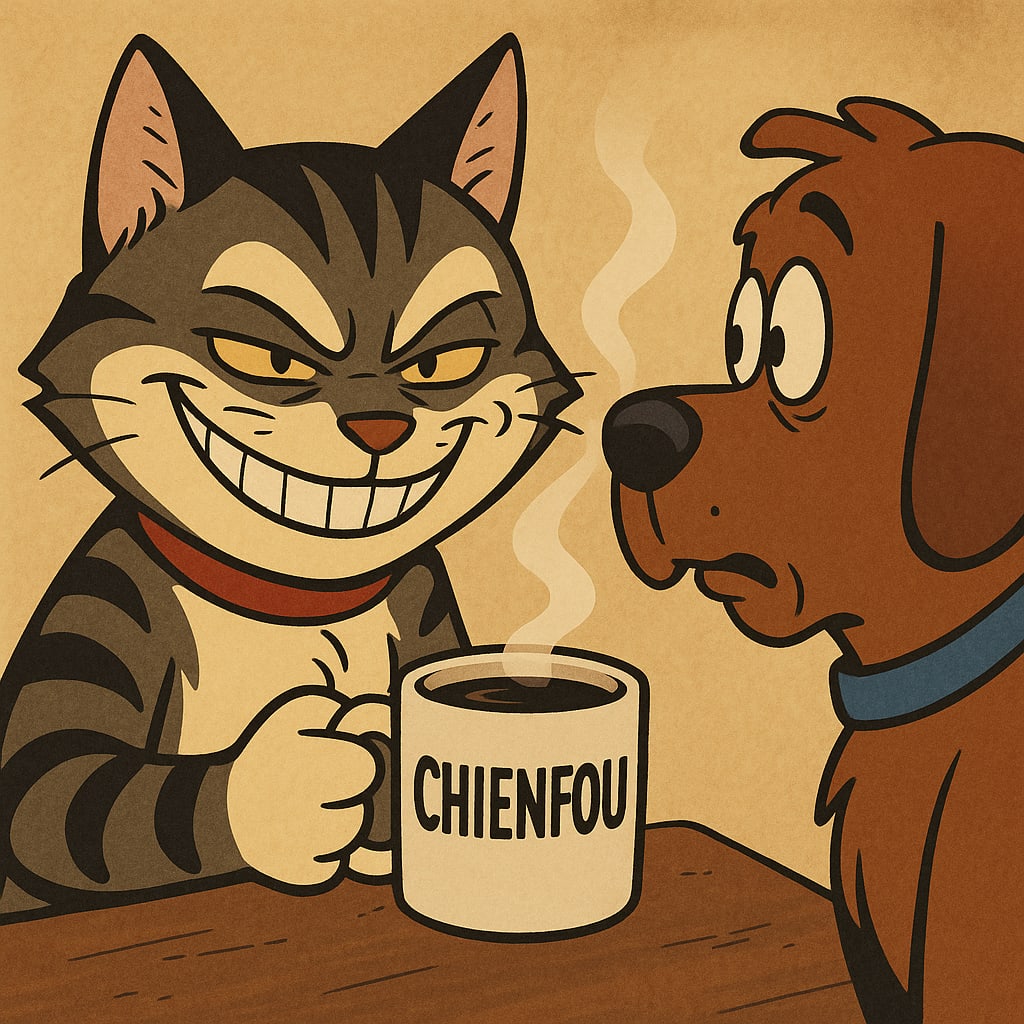 /showme an animated image of a cat named “chienfou” flashing a devilish grin at a dog named “capnjb” while drinking hot coffee from a mug