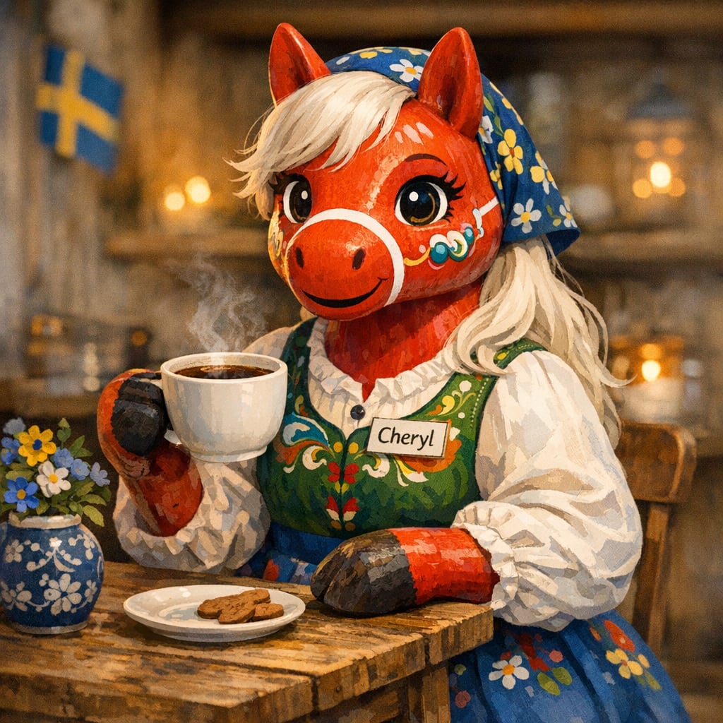@cfg83 Here’s the image you requested for “Anthropomorphized Traditional Wooden Swedish Dala Horse named Cheryl and drinking cup of coffee.”