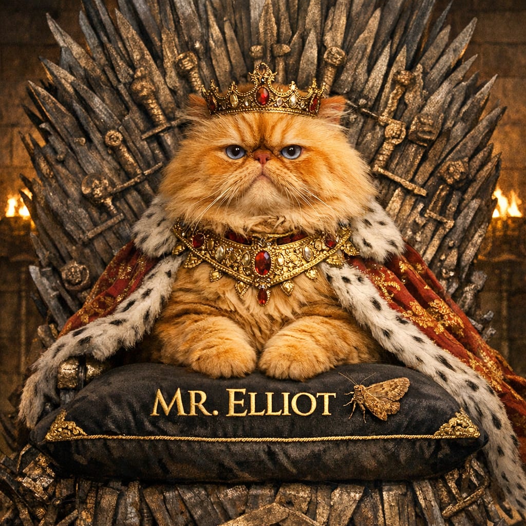 /showme The royal cat that looks like an orange Himalayan flat-faced breed of cat and is named MR. ELLIOT, is sitting on THE CUSHION POSITIONED ATOP THE IRON THRONE OF THE SEVEN KINGDOMS, KING OF THE ANDALS, THE RHOYNAR, AND THE FIRST MEN, AND WARDEN OF THE SMALL BROWN MOTH THAT LIVES BEHIND THE BATHROOM MIRROR.